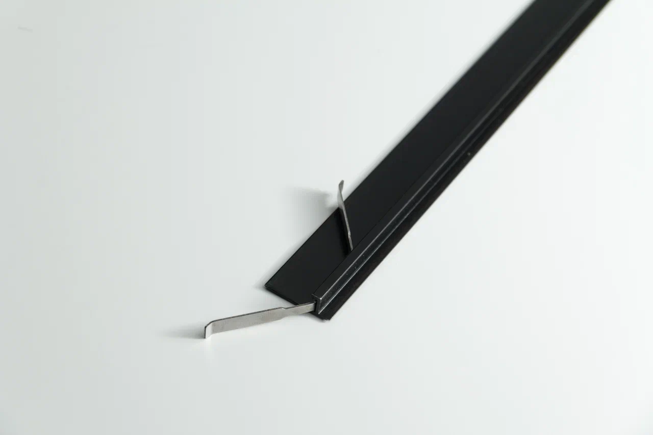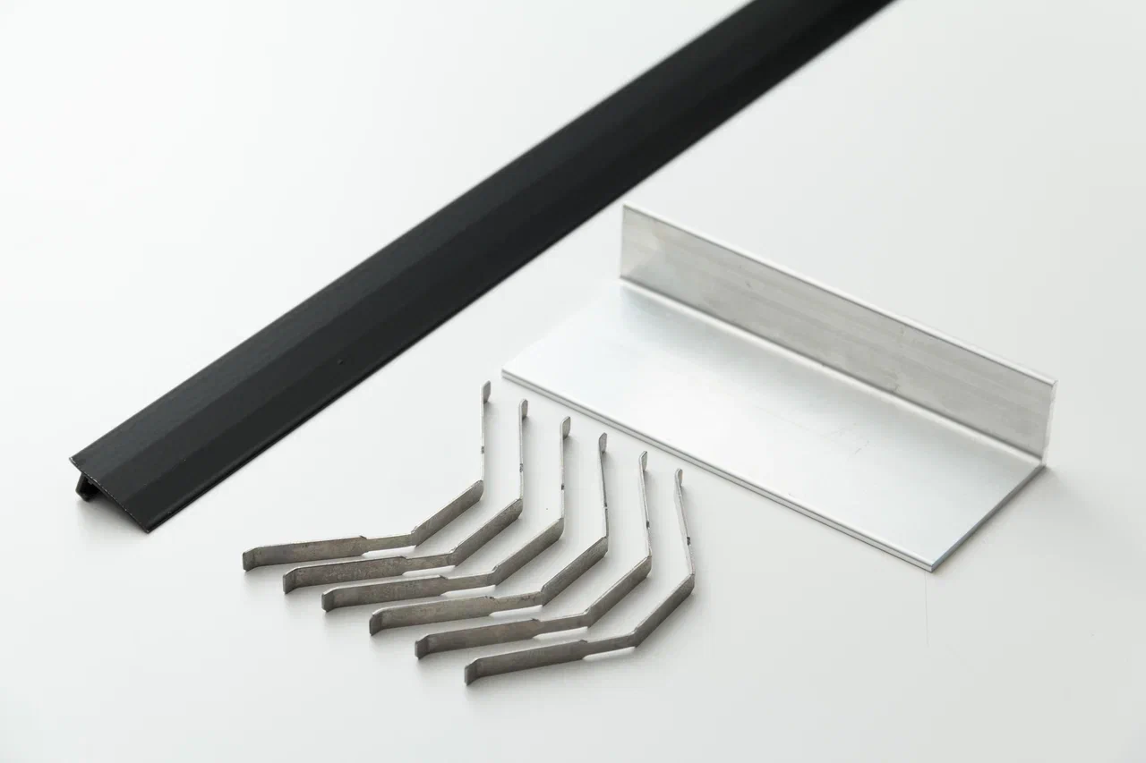 Алюминиевый порожек крепится в проем между двумя напольными покрытиями на клипсы из рессорной стали (на один порожек потребуется 5-6 клипс).