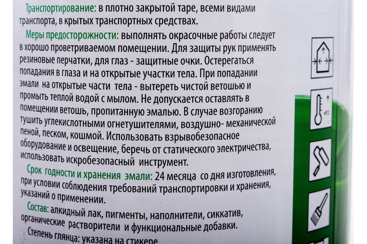 Готовое покрытие не желтеет со временем и устойчиво к влиянию влаги, бытовых чистящих веществ и масел. Эмаль обладает хорошей укрывной способностью и быстро высыхает. В составе продукта отсутствуют ароматические углеводороды.