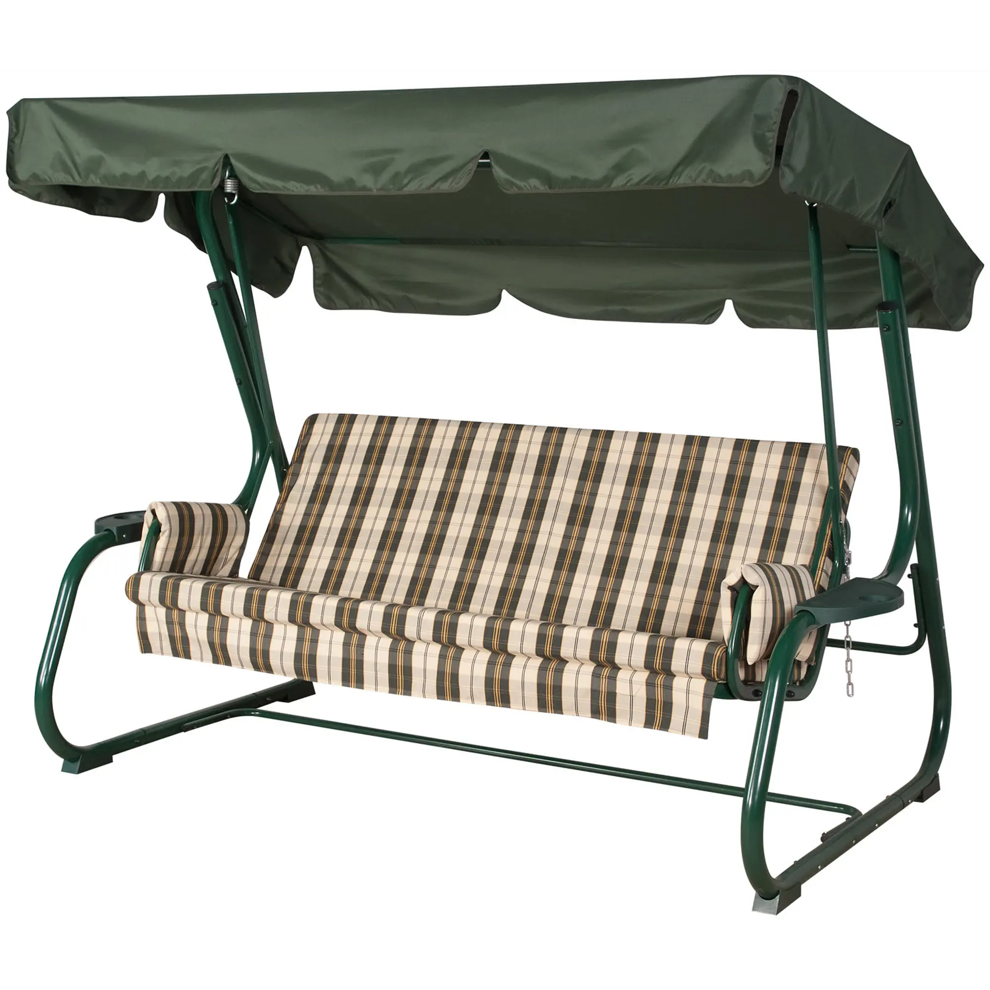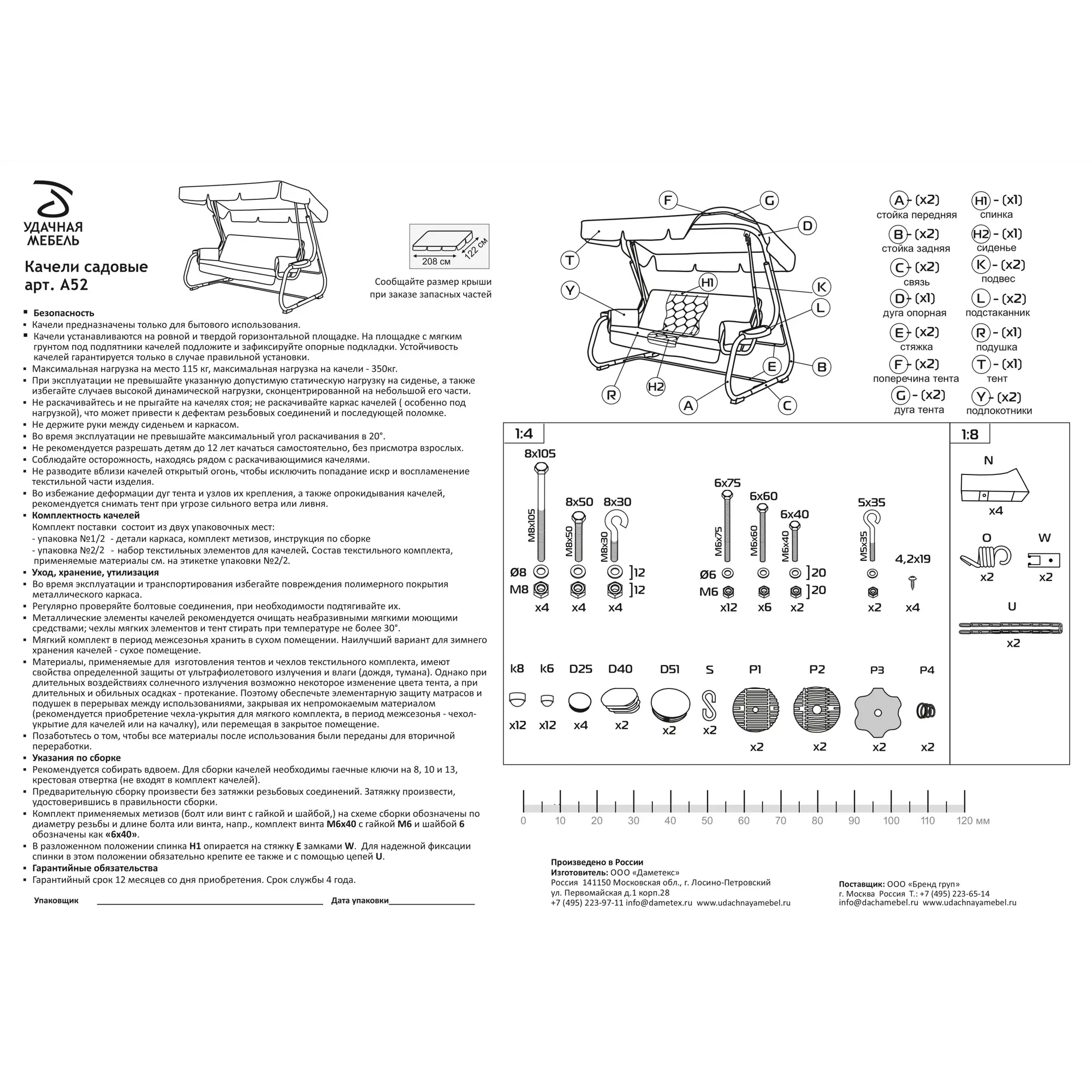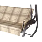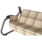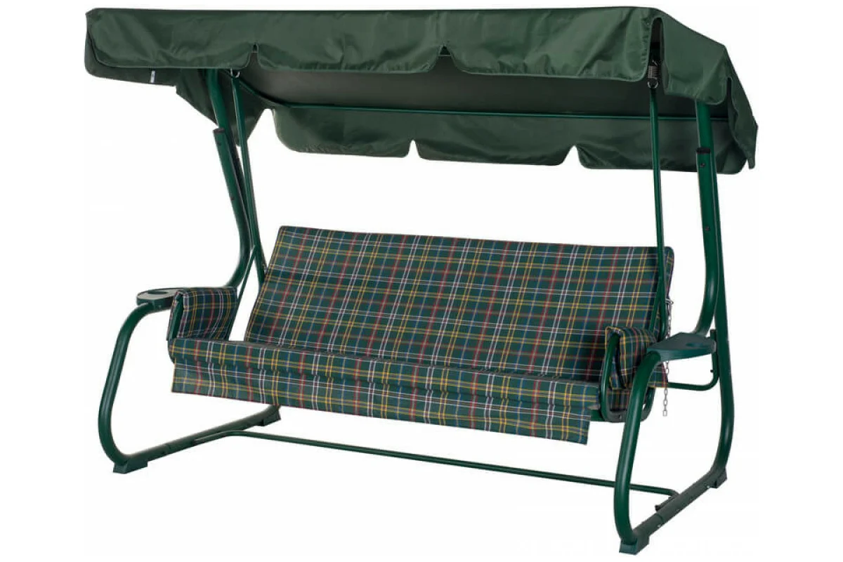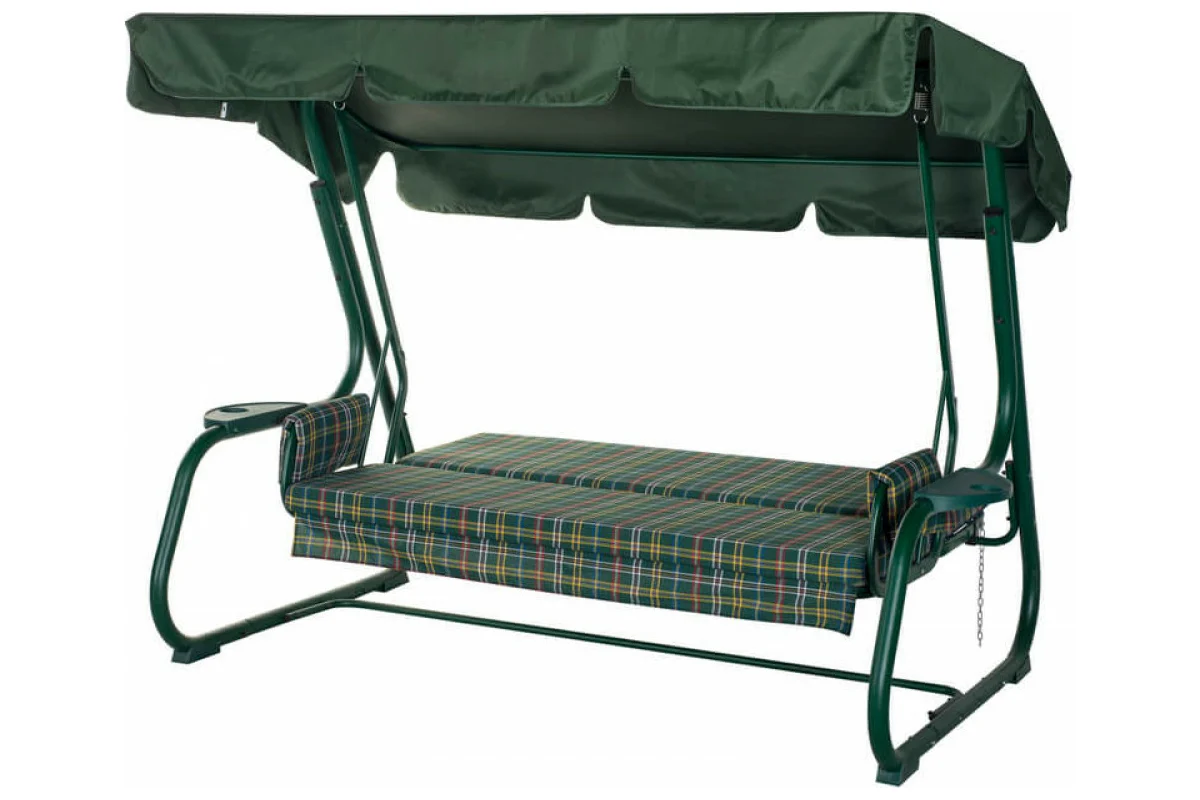Угол наклона спинки регулируется пошагово, при этом качели можно разложить полностью на 180 градусов. Основа сидения – оцинкованная сетка. Текстильный комплект изготовлен из плотной поликоттоновой ткани.