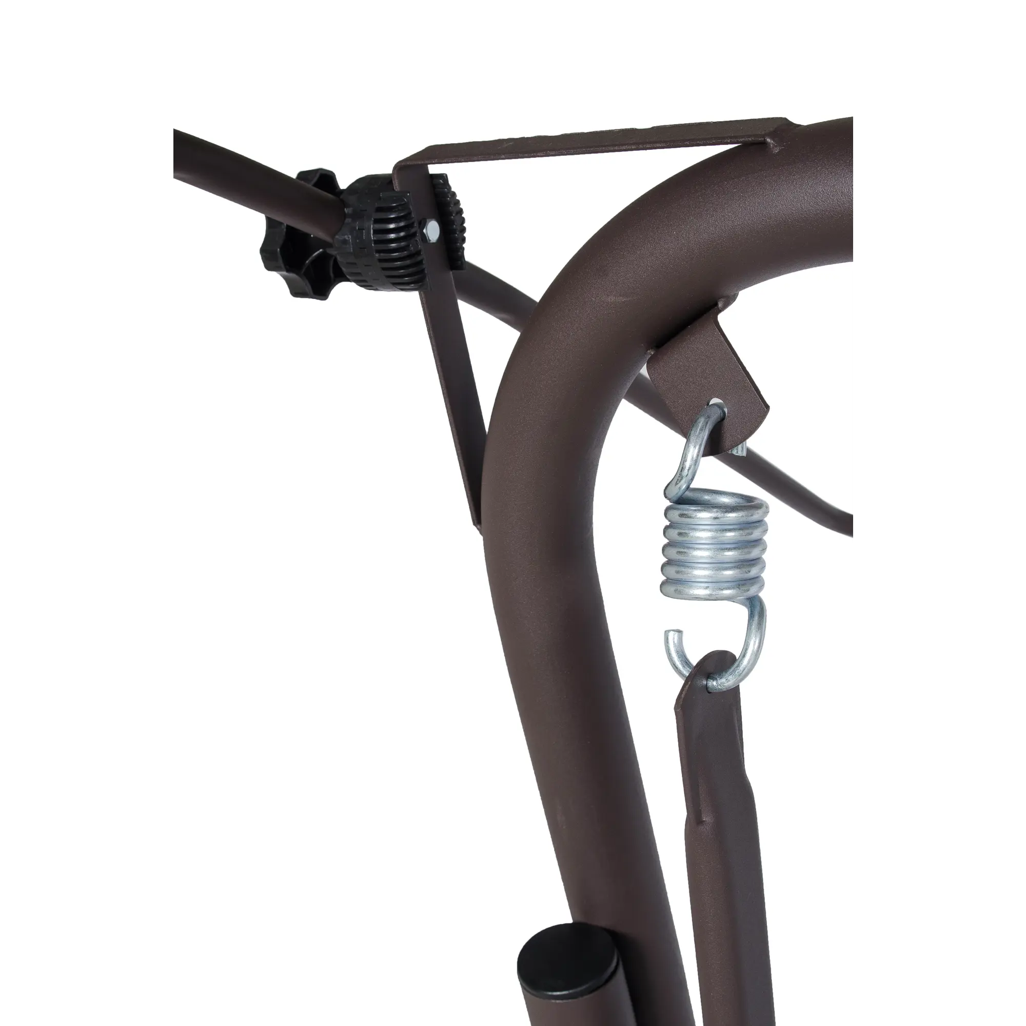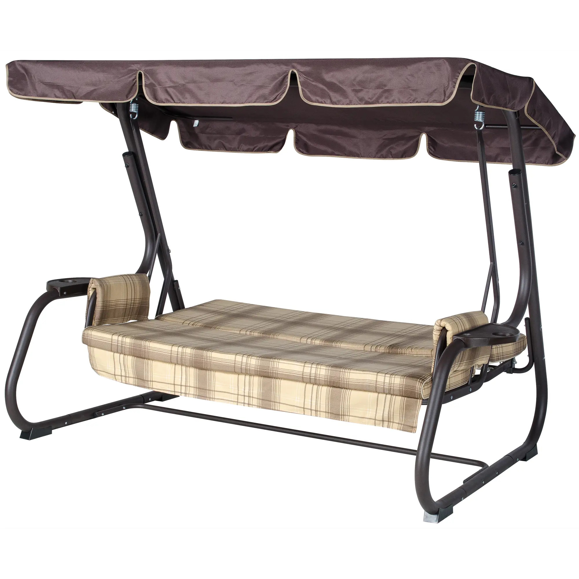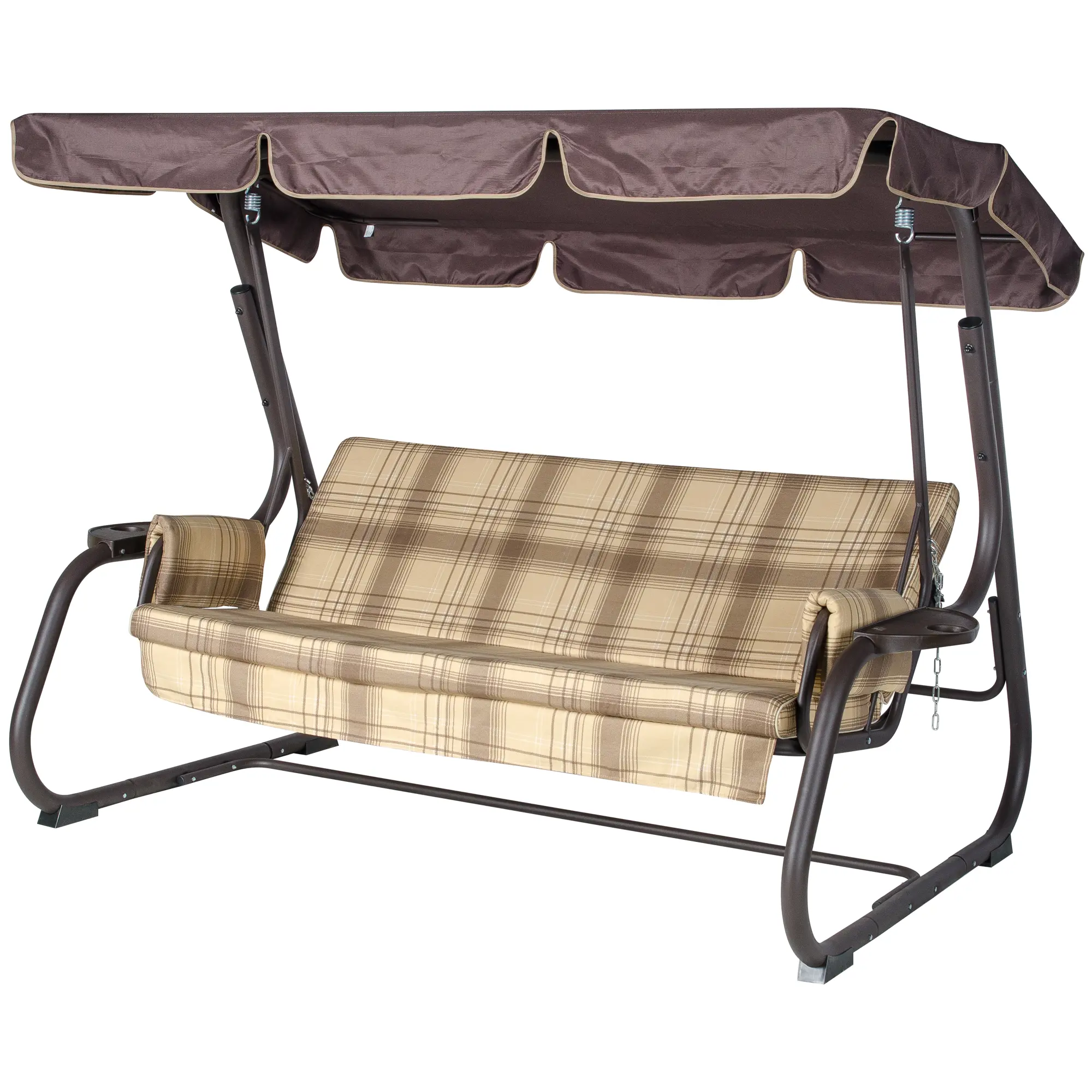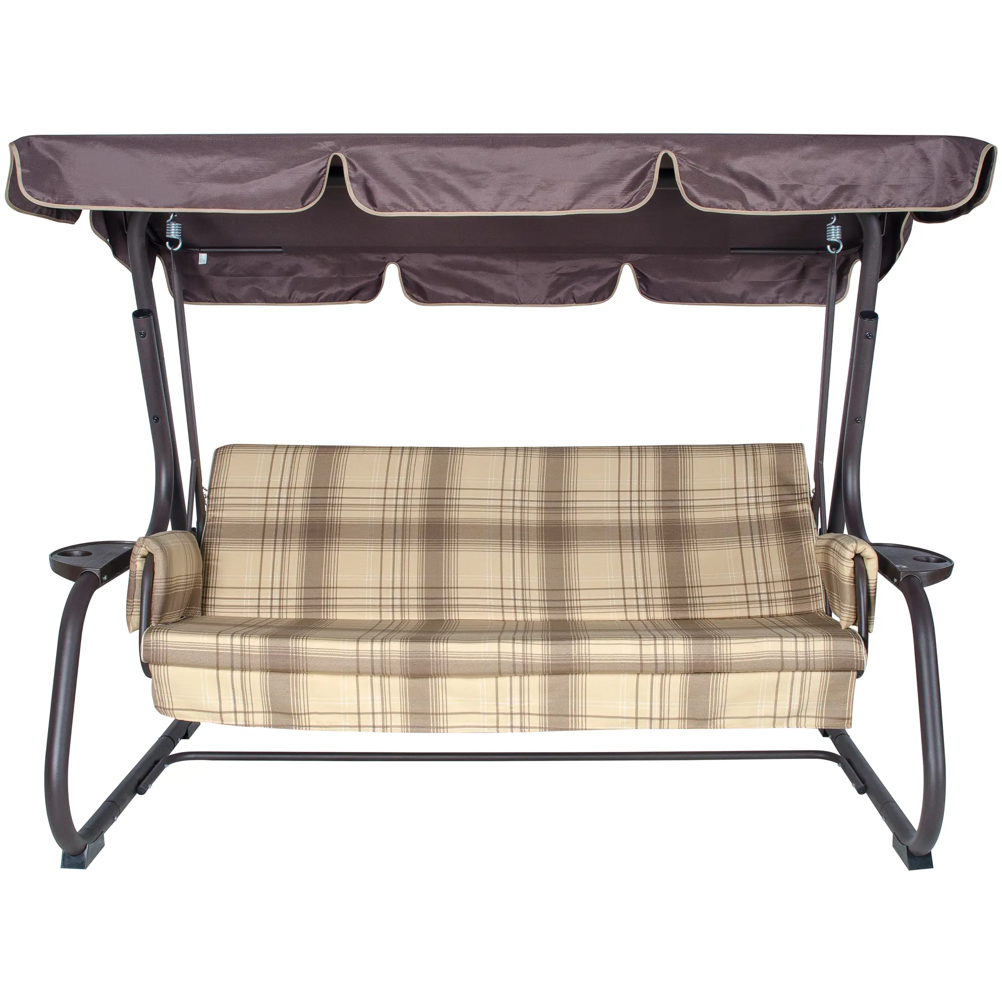 Угол наклона спинки регулируется пошагово, при этом качели можно разложить полностью на 180 градусов. Основа сидения – оцинкованная сетка. Текстильный комплект изготовлен из плотной поликоттоновой ткани.