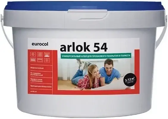 Твердо-эластичный водно-дисперсионный клей Eurocol Arlok 54 для укладки внутри помещения паркета и стандартизированной паркетной доски, плитки из нелакированной пробки и древесных плит на впитывающие влагостойкие основания.