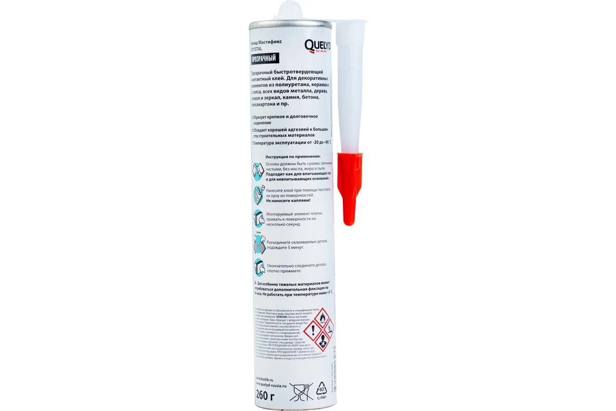 Quelyd Мастификс «CRYSTAL» (Келид Мастификс Кристалл) — это однокомпонентный клей на базе искусственных смол, который высыхает за счёт физического испарения растворителей. Он предназначен для универсального использования и обеспечивает сверхпрочное клеевое соединение, заменяя большинство монтажных клеев. При его применении не требуется сверлить отверстия в материале при креплении и склеивании деревянных досок, окон, гипсокартона, ДСП, камня, плитки, металла, пластика, резины и других материалов.