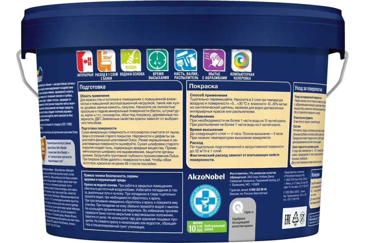 Краска для стен и потолков DULUX ULTRA RESIST КУХНЯ И ВАННАЯ матовая база BW для интерьеров, которые подвергаются воздействию влаги, пара. Рекомендуется применять данный материал в кухнях, ванных, санузлах, прачечных, душевых.