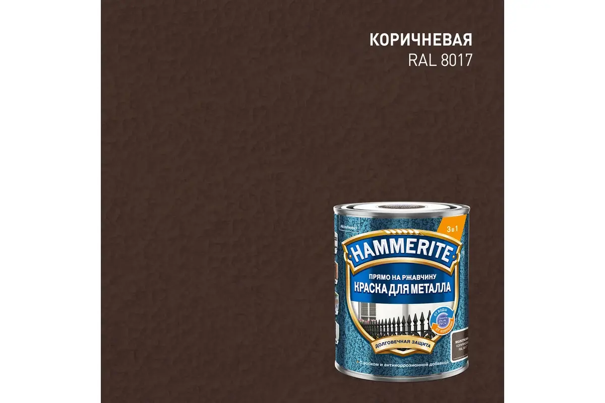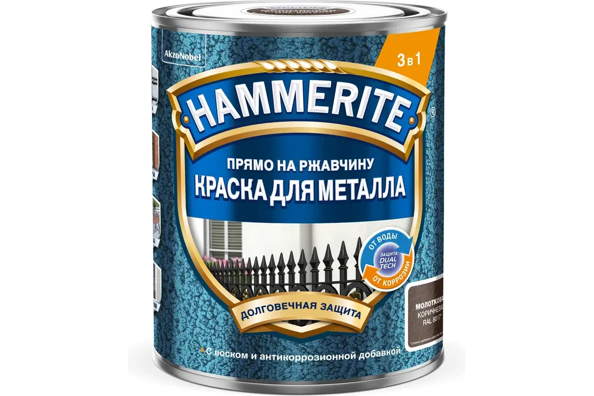 Краска Hammerite молотковая Коричневая для внутренних и наружных работ по металлическим поверхностям, включая ржавые и окрашенные. Создает эффект «ручной молотковой чеканки», скрывает неровности и повреждения. Содержит алюминиевые хлопья и силиконы для водостойкости и термостойкости до +80°C.