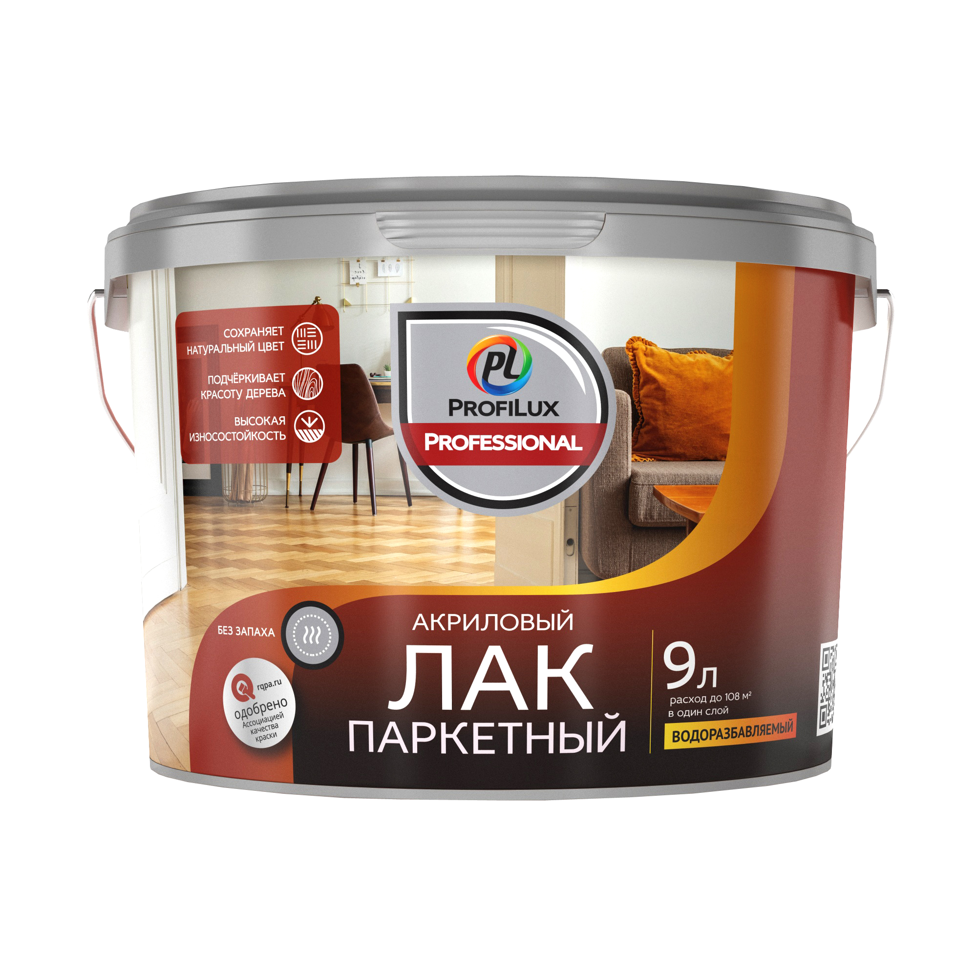 Лак паркетный акриловый Profilux Professional глянцевый предназначен для лакирования деревянных и паркетных полов, а также изделий из древесины, камня и кирпича в сухих помещениях. Создает прозрачную, износостойкую пленку, устойчивую к воде. Экологичен, без запаха, экономичен. Разбавляется водой.