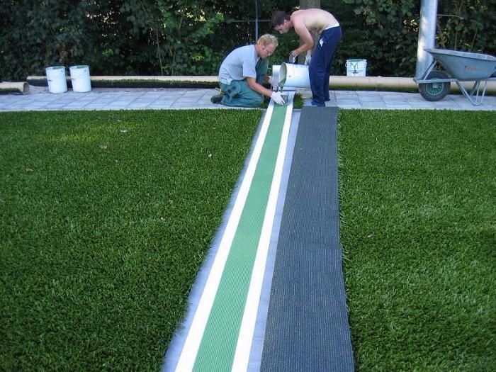 клей для искусственных газонов 160), затем окончательно уложить покрытие и прикатать валиком.