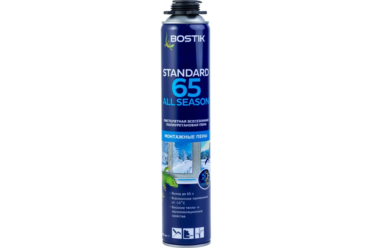 Bostik STANDARD 65 ALL SEASON представляет собой однокомпонентную монтажную пену. Этот материал затвердевает при взаимодействии с влагой из воздуха, образуя прочный, эластичный и устойчивый к механическим воздействиям шов. Такой шов эффективно защищает от проникновения пыли и воздуха, обеспечивая надежную герметизацию.
