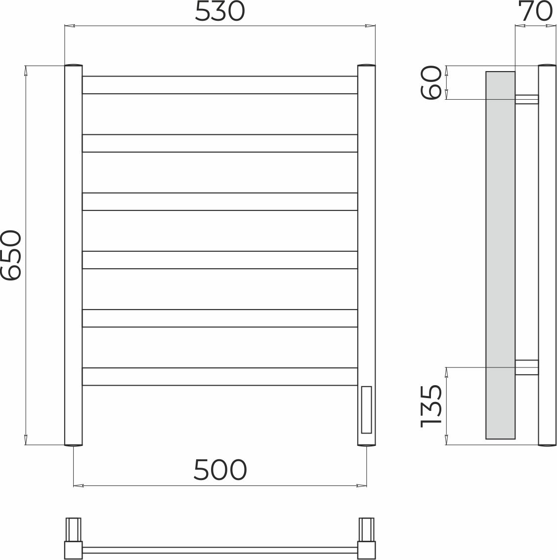 Полотенцесушитель электрический для ванной комнаты Терминус Ното П6 500х650 с универсальным подключением имеет форму лесенки. Изготовлен из прочной нержавеющей стали AISI 304L.