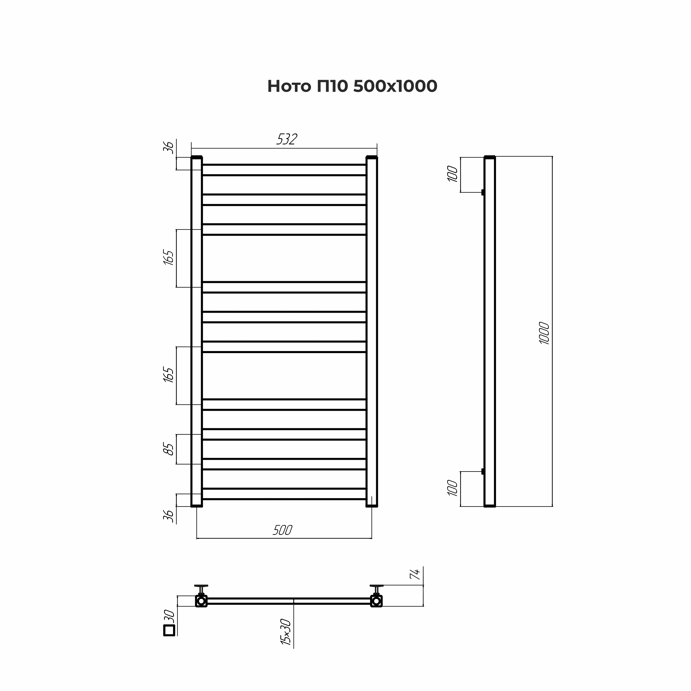 Полотенцесушитель водяной для ванной комнаты Терминус Ното П10 500х1000 с нижним подключением имеет форму лесенки. Изготовлен из прочной нержавеющей стали AISI 304L.