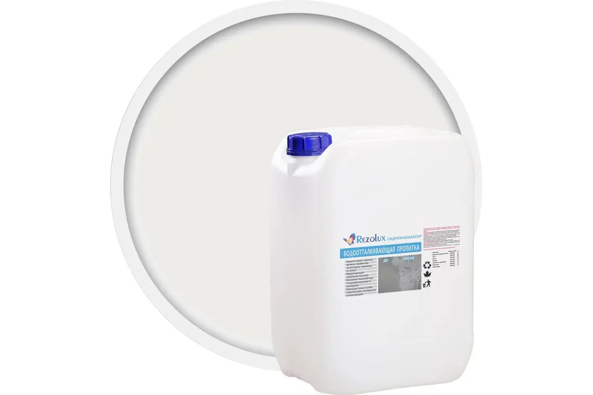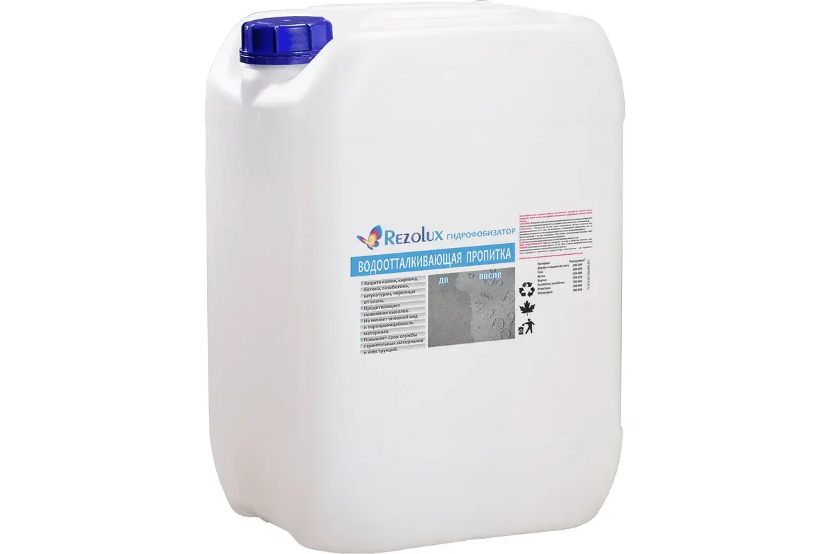 Rezolux Гидрофобизатор – высокоэффективное средство для защиты пористых строительных материалов от атмосферной влаги и капиллярного подсоса с антисептическими и противогрибковыми свойствами. Улучшенная формула обеспечивает защиту до 10-15 лет.