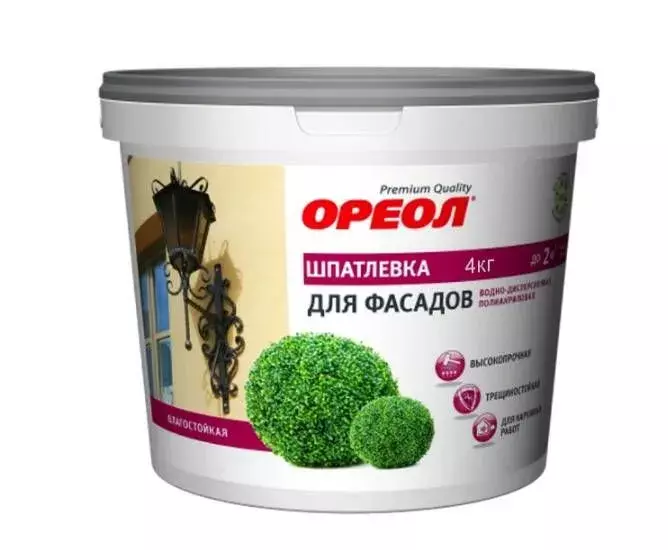 Шпатлевка для фасадов Ореол (влагостойкая; водно-дисперсионная; полиакриловая; для наружных работ) предназначена для выравнивания и устранения дефектов оштукатуренных, бетонных и гипсокартонных поверхностей фасадов, а также при отделочных работах по древесностружечным, древесноволокнистым плитам внутри помещений с повышенной влажностью.